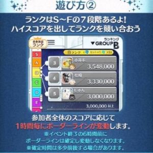S〜Fの各ランクの境界線(ボーダーライン)は、参加者全体のスコアに応じて変動します。これはたとえば、イベントが開始されて間もない頃は 350万点 とれてれば Aランクに入れたとしても、しばらく時間が経過して 400万点、500万点を取る人がゴロゴロ出てくると、350万点ではAランクに入れなくなって、Bランクに格付けされてしまう、ということです。このボーダーラインは常に変化し、1時間ごとに更新されるとのこと。一度高得点を出したからって安心できませんね。なお、イベントが終了する6時間前からこのボーダーラインは変動しなくなります。